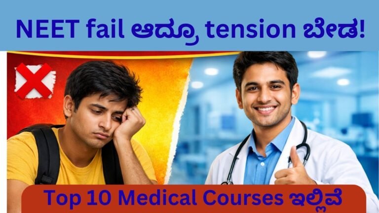 🎯 ದ್ವಿತೀಯ ಪಿಯುಸಿ ನಂತರ NEET ಇಲ್ಲದೇ ಮಾಡಬಹುದಾದ ಟಾಪ್ 10 ಮೆಡಿಕಲ್ ಕೋರ್ಸ್ಗಳು – ವಿದ್ಯಾರ್ಥಿಗಳ ಭವಿಷ್ಯಕ್ಕೆ ಸಂಪೂರ್ಣ ಮಾರ್ಗದರ್ಶಿ! 📢 ಪರಿಚಯ ಇಂದಿನ ದಿನಗಳಲ್ಲಿ …